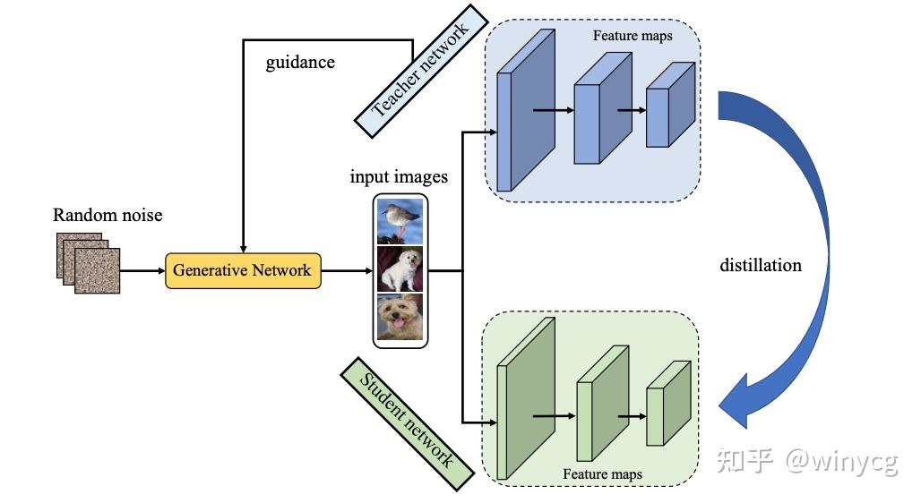 传统的KD方法通常需要大量的训练样本。然而,出于隐私或安全考虑,训练数据集有时可能是不可得到的。现有工作已经提出了一些方法来处理这个问题,主要分为无数据KD和数据集KD。无数据KD的示意图如下图7所示。