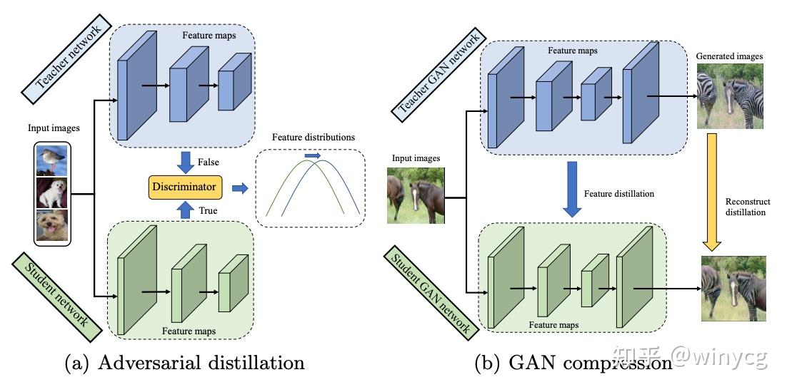 Aguinaldo等人引导一个较小的“学生”GAN对齐更大的“教师”GAN。Chen等人让学生生成器从相应的老师那里学习低阶和高阶知识。此外,学生鉴别器由教师网络通过triplet损失进行监督。Li等人通过从中间表示中转移知识并通过神经架构搜索探索高效架构,提出了一种用于条件GAN的通用压缩框架。Zhang等人指出,小型GAN通常难以生成所需的高频信息。小波KD通过离散小波变换将图像分解为不同的频带,然后只传输有价值的高频带。