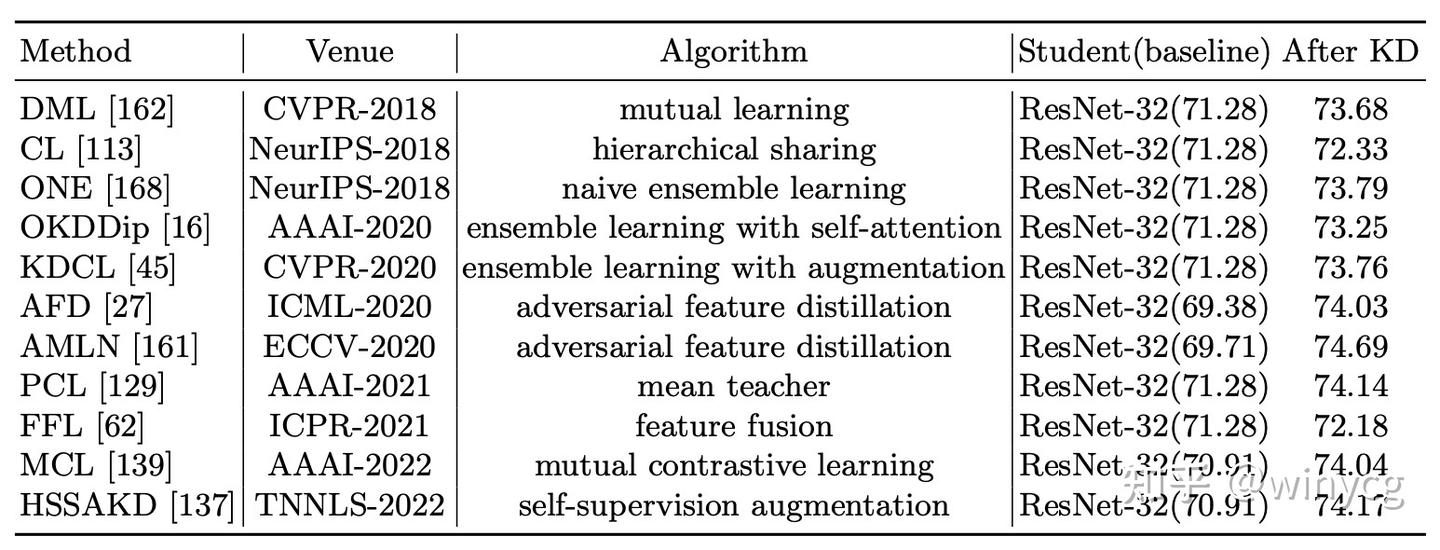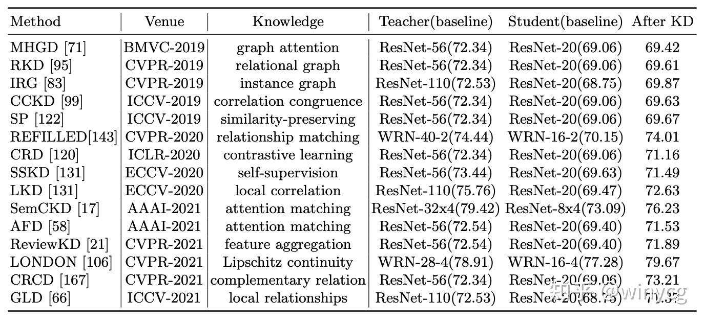 总结。我们在表3中对各种基于关系的KD方法进行了实验结果对比。不同于基于特征和基于响应的KD,基于关系的方法旨在捕捉各种样本或不同层之间的高阶关系。关系图捕获了整个数据集的结构化依赖关系。跨层特征关系对语义过程的信息进行编码。如何使用更有意义的节点转换和度量函数或聚合适当的层信息来建模更好的关系仍然是需要进一步研究的核心问题。