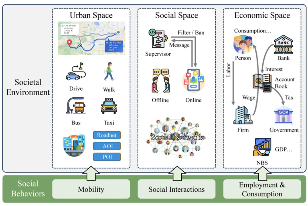 真实城市社会环境:精准模拟社会人赖以生存的城市空间,重现交通、基础设施和公共资源,使智能体能在真实环境约束下交互,形成逼真的社会生态。