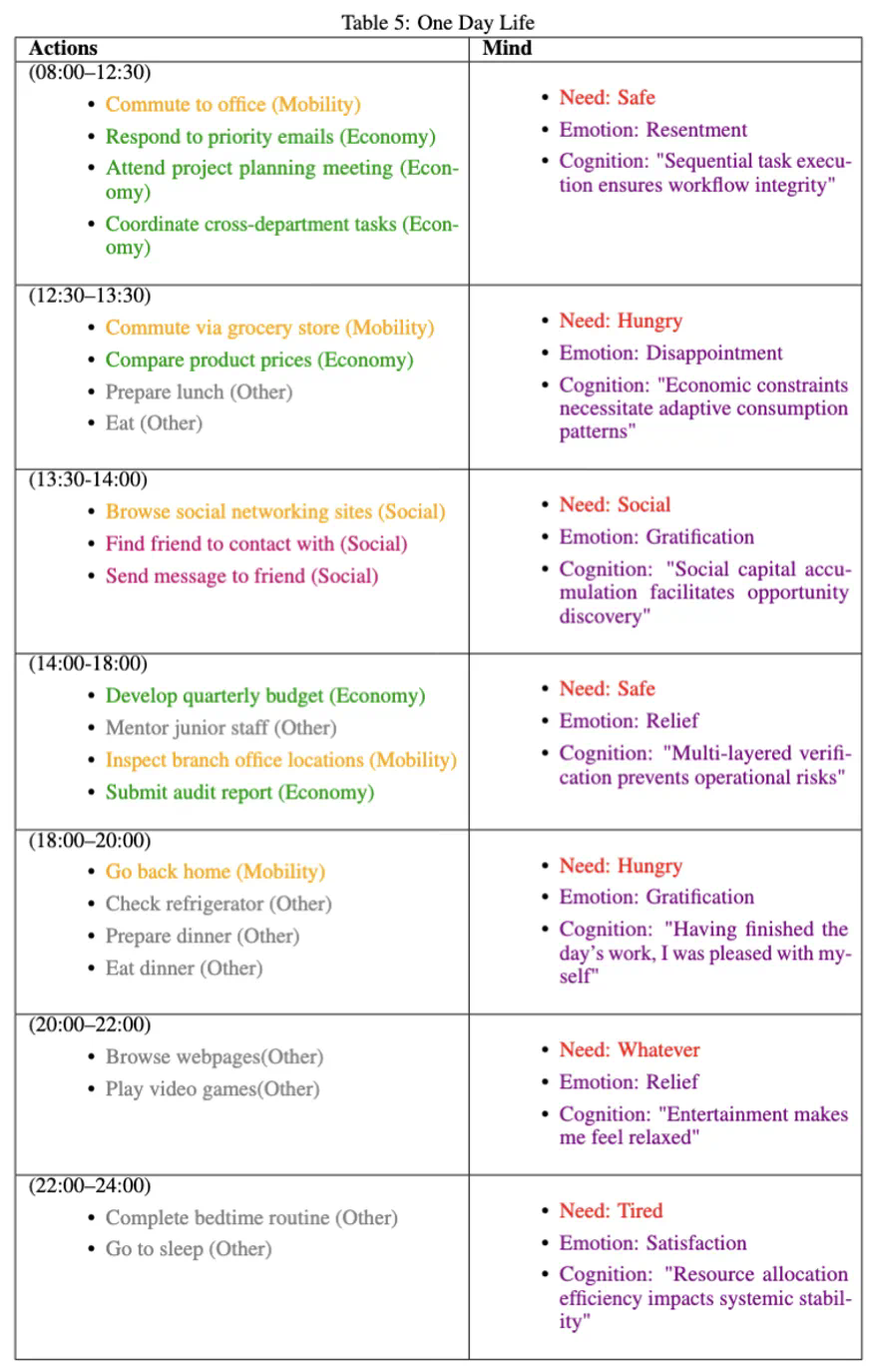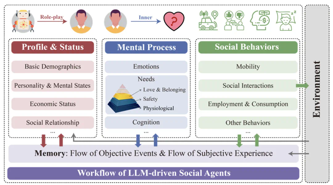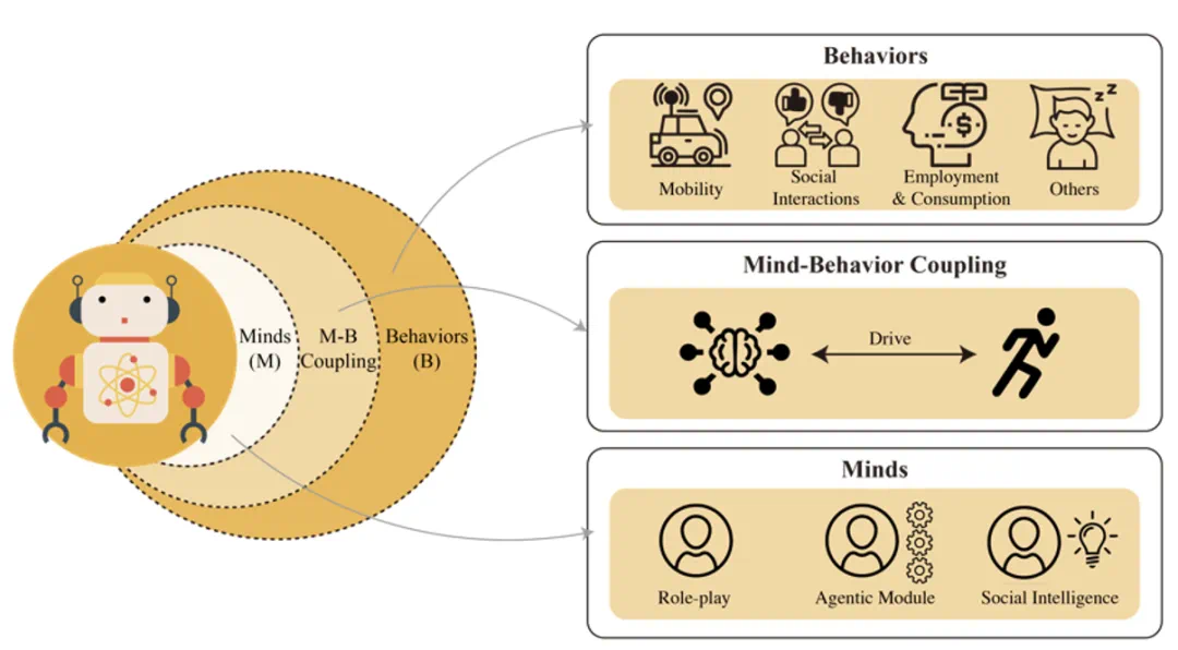大模型驱动的社会人智能体:基于社会学理论,构建具有 “类人心智” 的社会人智能体,赋予其情感、需求、动机与认知能力,并在这些心智驱动下进行复杂社会行为,如移动、就业、消费、社交互动等。