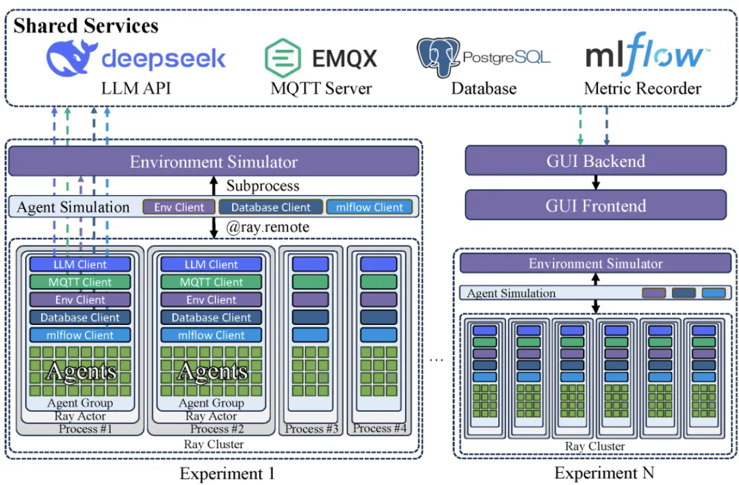 大规模社会模拟引擎:采用异步模拟架构与 Ray 分布式计算框架,结合智能体分组和 MQTT 高并发通信,实现高效、可扩展的智能体交互与社会行为模拟。