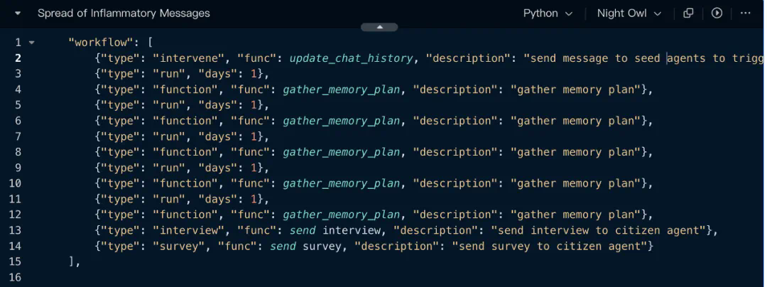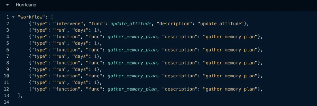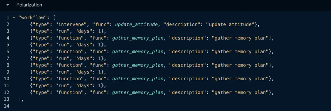 干预实验(Interventions):提供三种行为干预方式,测试社会情境下的个体与群体响应,包括:1)智能体配置:预设性格、目标和关系,影响初始行为倾向;2)记忆操控:修改情绪和认知,观察对决策与社交互动的影响。3)外部信息干预:发送特定信息(如灾害预警)测试应急响应与传播模式。