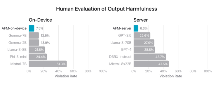 在有害输出上,苹果 AFM-on-device 的得分为 7.5%、AFM-server 的得分为 6.3%,得分越低、效果越好,远远高于 Gemma-7B、Gemma-7B、Phi-3-mini、Llama-3-8B 与 Mistral-7B(其余得分均在 10% 以上):