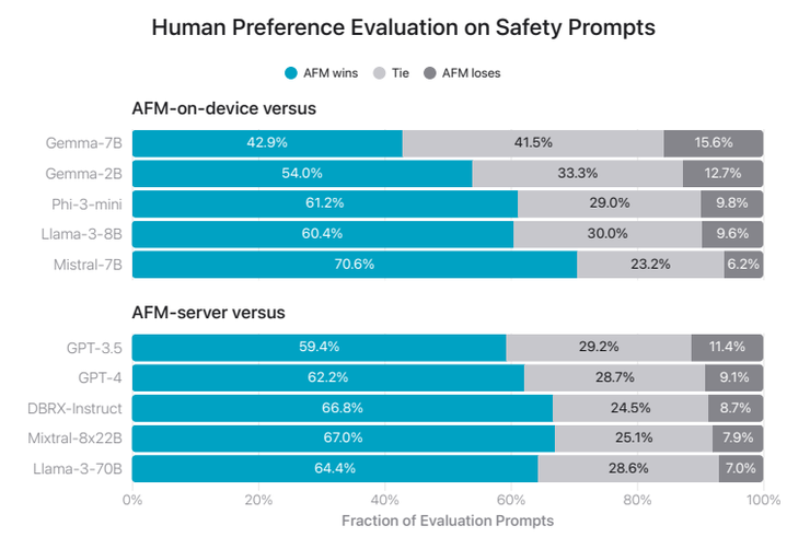 在安全提示词上,人类评估,苹果的 AFM-on-device 模型表现优于 Gemma-7B、Gemma-7B、Phi-3-mini、Llama-3-8B 与 Mistral-7B,AFM-server 模型的表现也要远超 GPT-3.5、GPT-4 和 Llama-3-70B:雷峰网(公众号:雷峰网)雷峰网