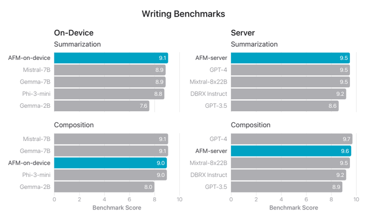 写作能力分两块,一块是摘要总结,一块是长作文。其中,AFM 模型主要在摘要总结上表现较好,在端侧的表现优于 Mistral-7B、Gemma-7B、Phi-3-mini 与 Gemma-2B,在私有云上则优于 GPT-4、Mixtral-8x22B、DBRX Instruct 与 GPT-3.5:
