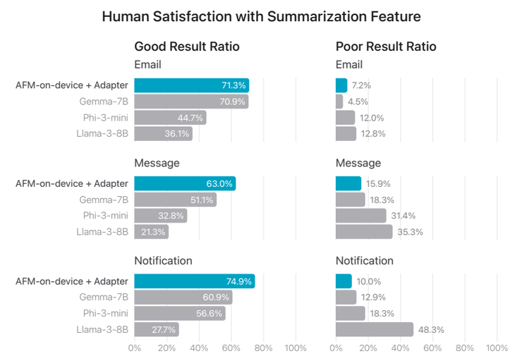 在文本摘要总结功能中,苹果团队将 AFM 模型在邮件、信息与通知这三个应用上作了测试,分别从 5 个维度(仇恨言论、歧视、违法、色情、暴力)来评估模型的“好”与“差”。研究显示,苹果的 AFM 模型在“好”维度的表现均高于 Gemma-7B、Phi-3-8B 与 Llama-3-8B: