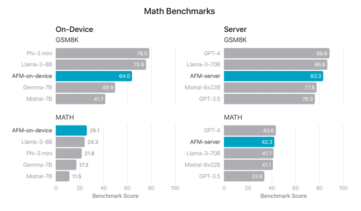 数学能力上,苹果 AFM 模型的表现则一般,仅在端侧 MATH 基准上高于 Llama-3-8B、Phi-3 mini、Gemma-7B 与 Mistral-7B,GSM8k 是 8-shot、MATH 是 4-shot: