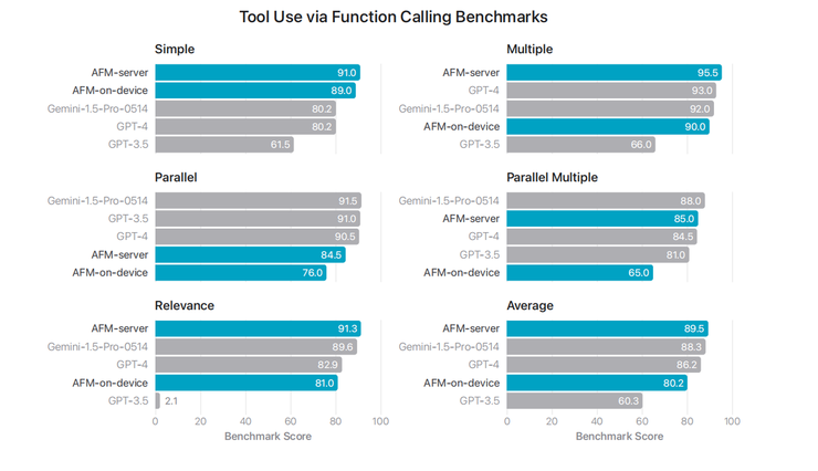 苹果还测试了在调用工具使用基准测试中 AFM 模型的表现,分别从简单(Simple)、多重(Multiple)、并行(Parallel)、并行多重(Parallel Multiple)、相关性(Relevance)和平均(Average)几个纬度展开。