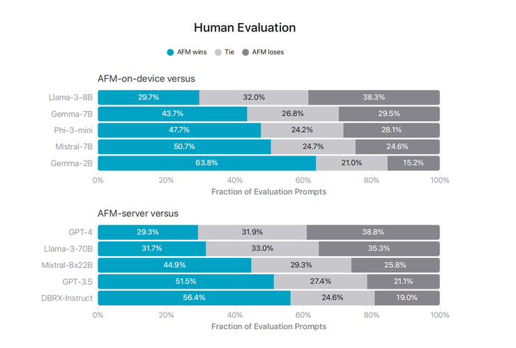 在人类评估中,在端侧,AFM 仅输于 Llama-3-8B ,而与其他模型相比显然更优。据论文介绍,AFM 与 Phi-3-mini 相比,模型尺寸小了 25%,而胜率达47.7% ,AFM 甚至超出参数数量为两倍多的 Gemma-7B 和 Mistral-7B。而在私有云上,与GPT-3.5相比时,AFM 也具有一定竞争力,胜率超 50%。