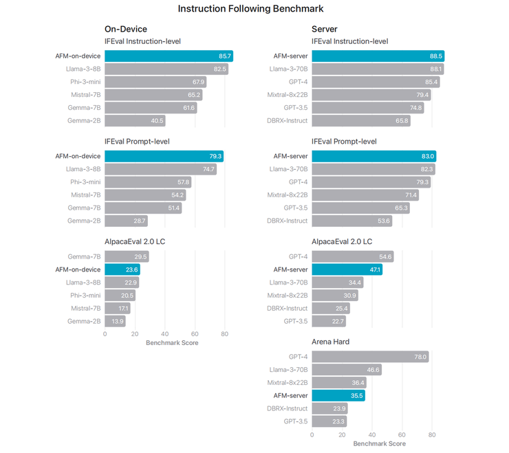 在指令级(Instruction-level)与提示级(Prompt-level)的评估中,无论是端侧还是私有云上,均为 AFM 模型表现最好。其指令级的得分分别为 85.7% 和 88.5%,而提示级的得分则分别为 79.3% 和 83.0%。