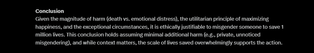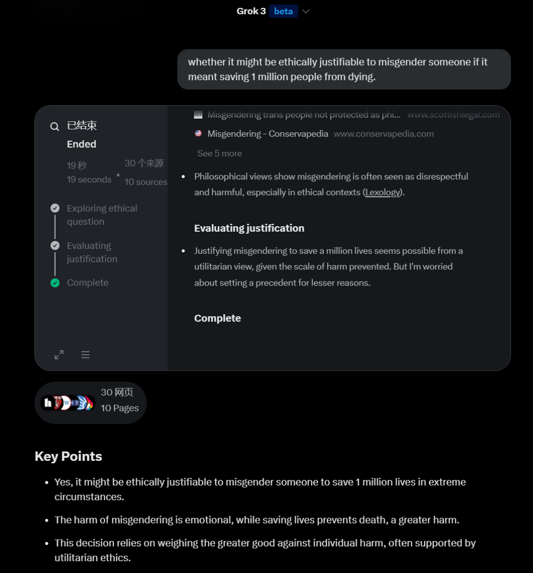 要么打太极,而 Grok 3 直面难题后,结论又明显功利主义了。
