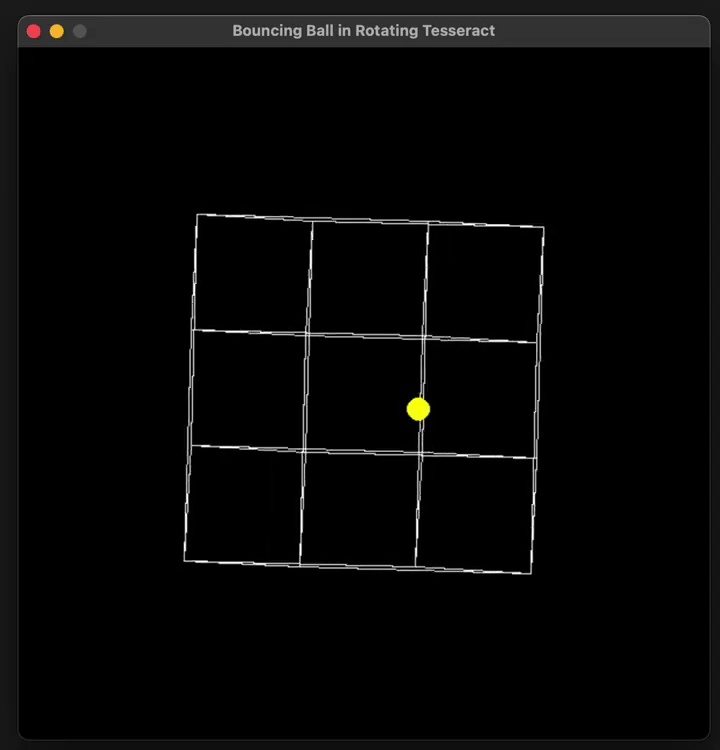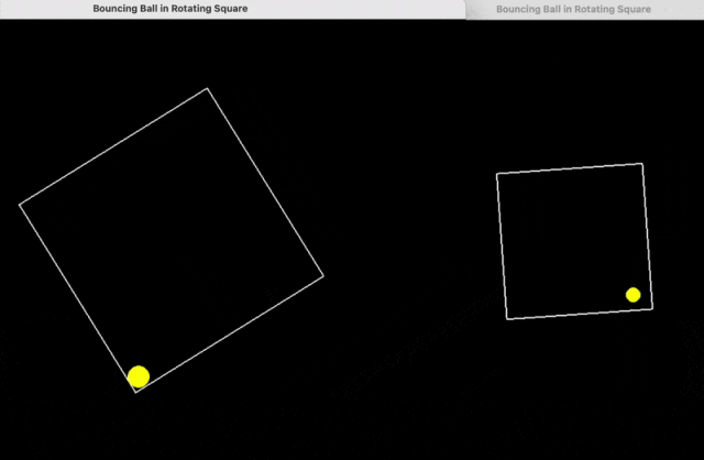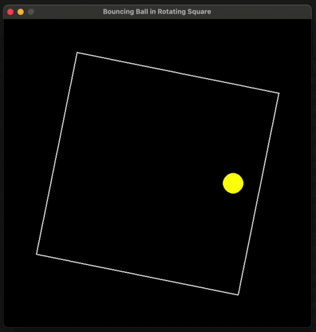 比如,用 python 编写一个在正方形内弹跳的黄色小球的脚本,正确处理碰撞,使正方形缓慢旋转。