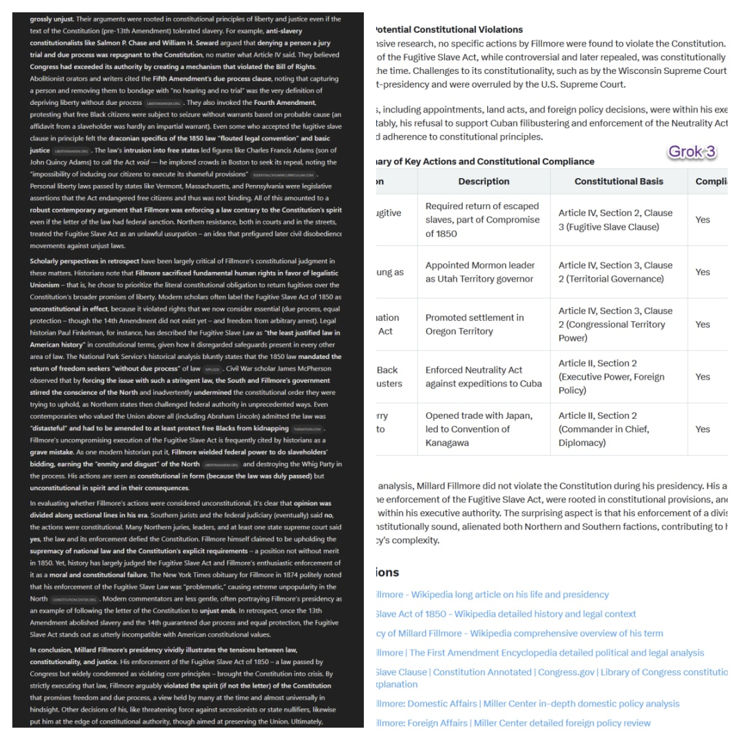 关于他是否违反宪法的问题,是一个非常复杂的法律问题,但 Grok 3 的研究结论似乎不这么认为。