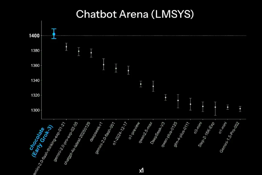 在大模型竞技场 Chatbot Arena(LMSYS)中,早期 Grok-3 版本的得分取得了第一,达到 1402 分(有史以来第一个),超过了包括 DeepSeek-R1 在内的所有其他模型。
