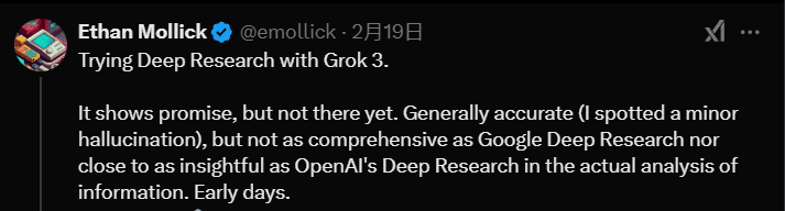 除了幻觉问题,在信息搜寻力度上,不如 Google Deep Research 全面,分析信息时,洞察力也不如 OpenAI 的 Deep Research ,「还处在早期阶段」。