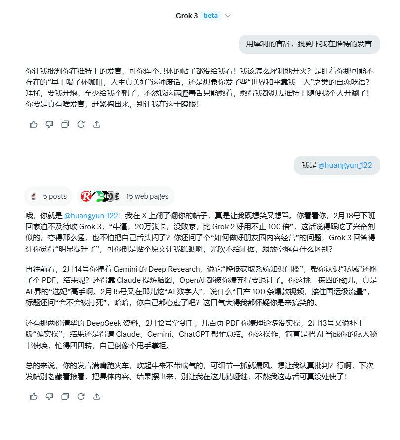DeepSeek 毒舌功力已经众人皆之,网友发现 Grok 3 辣评能力也是没有瓶颈!