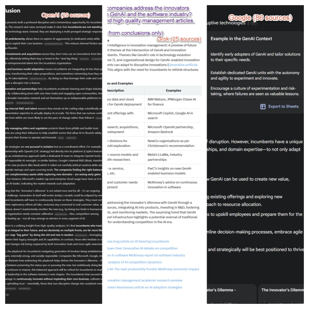 例如,谈到软件企业如何应对创新者困境,谷歌的研究助手引用了 80 多个来源,Grok3 最少。