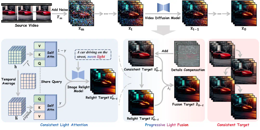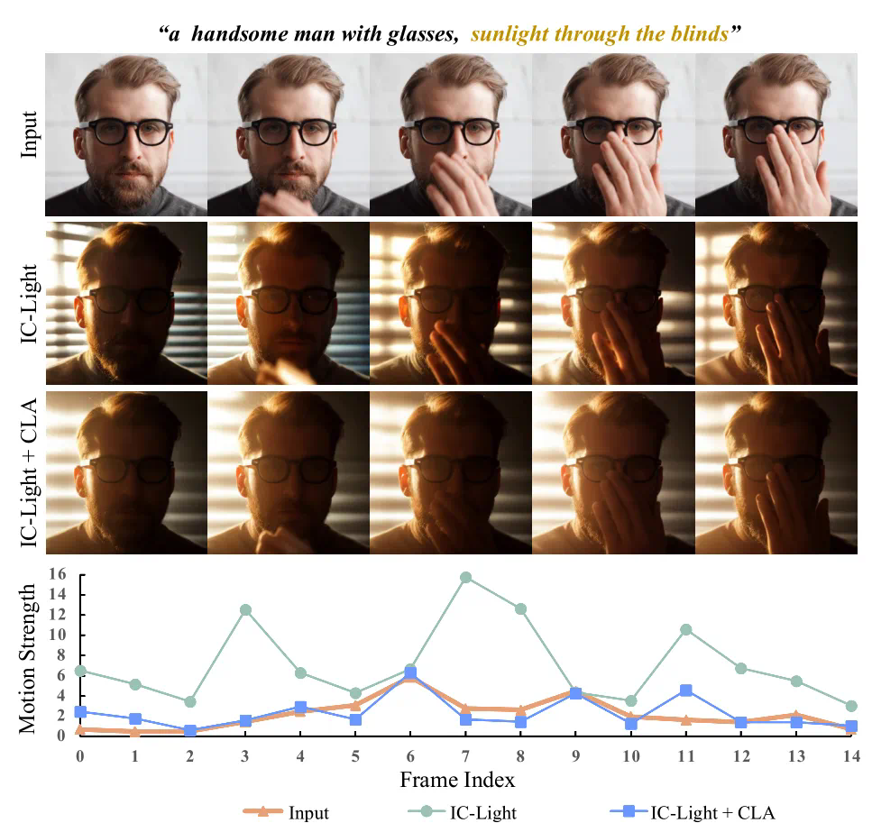 输入图片重打光模型(IC-Light),并利用 CLA 的双流注意力模块进行逐帧重打光,实现稳定的背景光源生成,作为当前步的重打光的目标