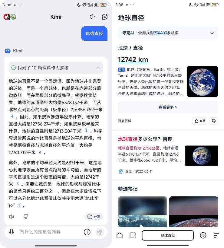 比如用 Kimi 和夸克同时输入“地球直径”这个搜索词,得到的结果是这样的: