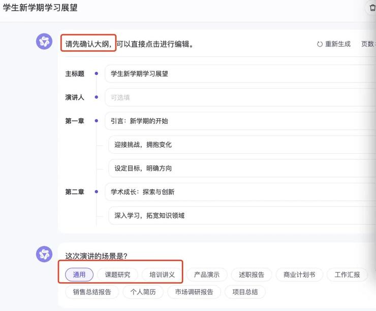 另外,相较于以往 PPT 制作过程中,用户往往使用传统PPT工具所提供的模版,风格相对单一、固定,而有了 AI 大模型加持的新型 PPT 创作,与用户的交互方式发生了改变,从想法构思到内容生成、设计美化,用户可以参与其中与 AI 共创。