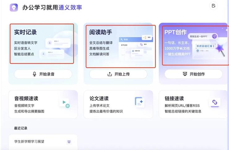 其实,通义此次上线的新功能不仅仅是 PPT 创作。在通义网页版,音视频转文字产品“通义听悟”正式更名为“实时记录”、长文档阅读助手“通义智文”更名为“阅读助手”,与 PPT 创作功能共同合并为通义效率,实现从信息整理、阅读理解到内容创作的完整工作学习流。