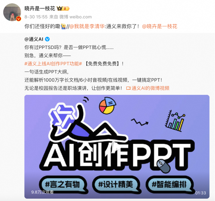 而听了赵晓卉的这一遭吐槽,通义 AI 直接坐不住了,紧急上线接梗——“别急”,通义 AI PPT 励志要帮助“每一位晓卉”告别 PPTSD,实现快乐上班。