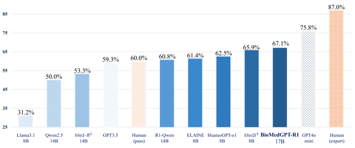 图 3:在 USMLE 美国医师资格考试评测集上效果逼近闭源商用大模型和人类专家水平