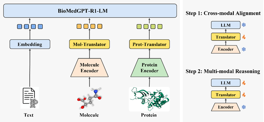 BioMedGPT-R1 的训练分为两个主要步骤(图1):首先,仅训练对齐翻译层 Translator,使其能将编码后的生物模态表征映射到语义表征空间;然后,同时微调对齐翻译层 Translator 和基座大语言模型,激发其在下游任务上的多模态深度推理能力。