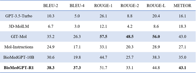 清华大学 AIR 和水木分子研究团队长期持续维护 OpenBioMed 开源平台(https://github.com/PharMolix/OpenBioMed),团队现阶段探索方向是如何在强推理语言模型的基础上更好地适应性地实现跨模态对齐,团队正在以 BioMedGPT-R1 为基础进行系统性研究与综合评估,目前已经观察到其在化学分子理解任务上的性能提升,如在 CheBI-20 化学分子描述任务上相比上一版本效果提升超 15%(表 1),后续也将依托 OpenBioMed 平台开源 BioMedGPT-R1 模型和生物医药研发 Agent 系统框架。