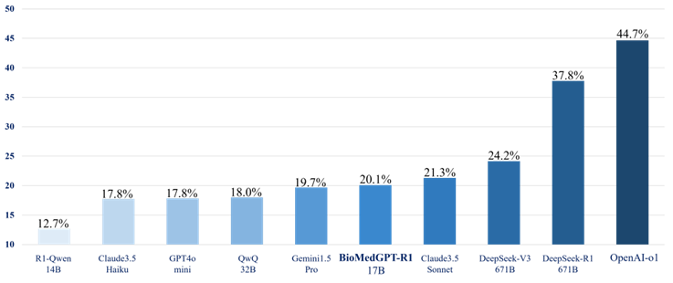 BioMedGPT-R1 在生物医药相关文本问答任务上也展现出了较优的效果,如在 USMLE美国医师资格考试上达到了 67.1% 正确率,效果逼近闭源商用大模型和人类专家水平(图 3),并在专家级医疗推理与理解评测集 MedXpertQA 上达到和闭源商用大模型相当的效果(图 4),团队正在探索生物医药场景下的多个深度推理能力应用,期待让「强推理慢思考」赋能医药研发。
