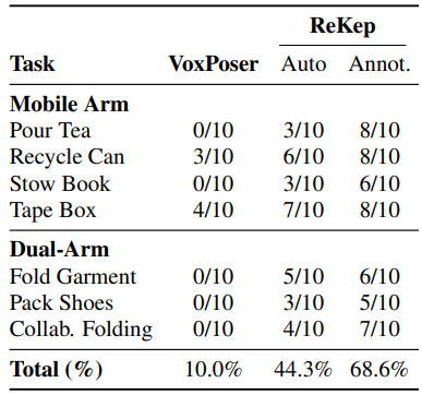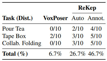 实验结果显示,ReKep在多种任务上的成功率较高,证明了其在自动化操控任务中的潜力。成功率根据任务的不同而有所差异,但总体上表现良好。