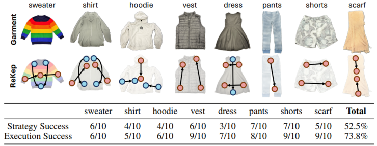ReKep 用于折叠不同类别服装的新型双臂策略及其成功率