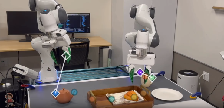 以倒茶这个动作为例,机器人会先用摄像头确定茶杯茶壶等的位置、形状等要素,再识别出关键点,比如茶杯的中心点和把手的中心点,ReKep 会给机器人编写出一系列规则,告诉它要用什么角度、怎么拿怎么倾倒、用多大力气等,机器人只要按照规则行动就能成功倒茶了。