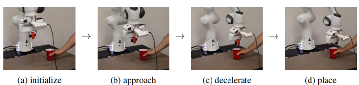机器人的任务是将其抓手中的物体送入人类手中的杯子中。每次演示包括四个主要阶段:(a) 随机初始化机器人位置,(b) 接近目标杯子,(c) 在目标杯子附近减速,(d) 释放物品。目标杯子的位置可能会在演示过程中发生变化。