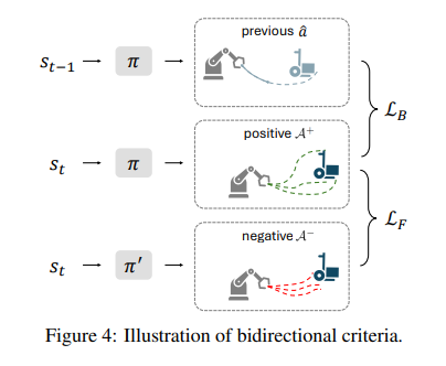 这里,ρ 是一个衰减超参数,用于解释不确定性随时间增长而增加的情况。这种后向损失鼓励相邻步骤之间采用类似的潜在策略,同时允许逐步适应不可预见的过渡动态。