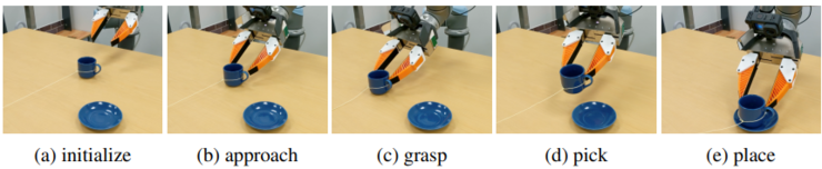 机器人的任务是拿起一个杯子,并将其放在附近的碟子上。四个主要阶段是:(a) 初始化机器人,(b) 接近目标杯子,(c) 抓住目标杯子,(d) 拿起杯子,(e) 将杯子放到目标碟子上。目标杯子的位置可能会在一个过程中发生变化。