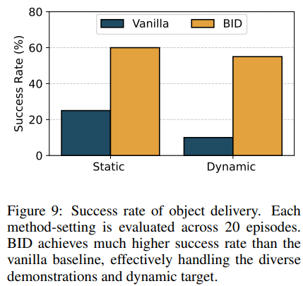 结果表明,在动态环境中,相比其他方法,BID 的成功率至少提高了2倍,同时在静态环境中保持了其性能。