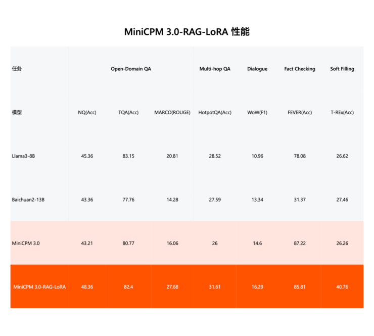 经过针对 RAG 场景的 LoRA 训练后,MiniCPM 3.0-RAG-LoRA 在开放域问答(NQ、TQA、MARCO)、多跳问答(HotpotQA)、对话(WoW)、事实核查(FEVER)和信息填充(T-REx)等多项任务上的性能表现,超越 Llama3-8B 和 Baichuan2-13B 等业内优秀模型。