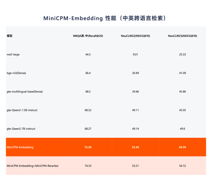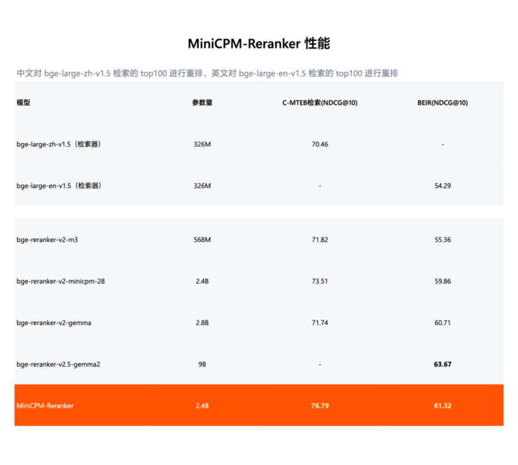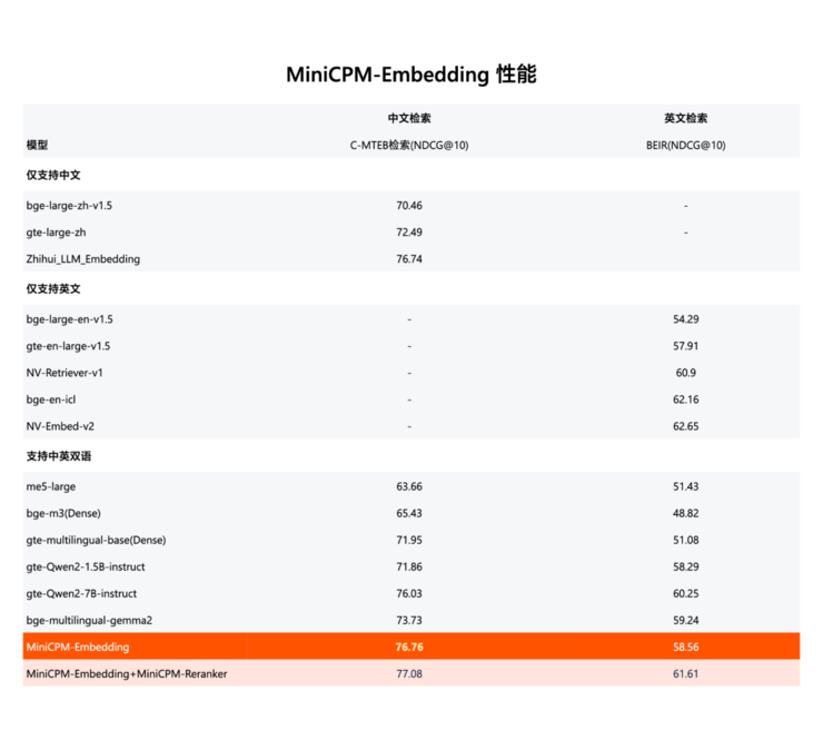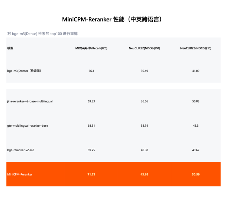 MiniCPM-Reranker(重排序模型)在中文、英文、中英跨语言测试上取得 SOTA 性能 ;