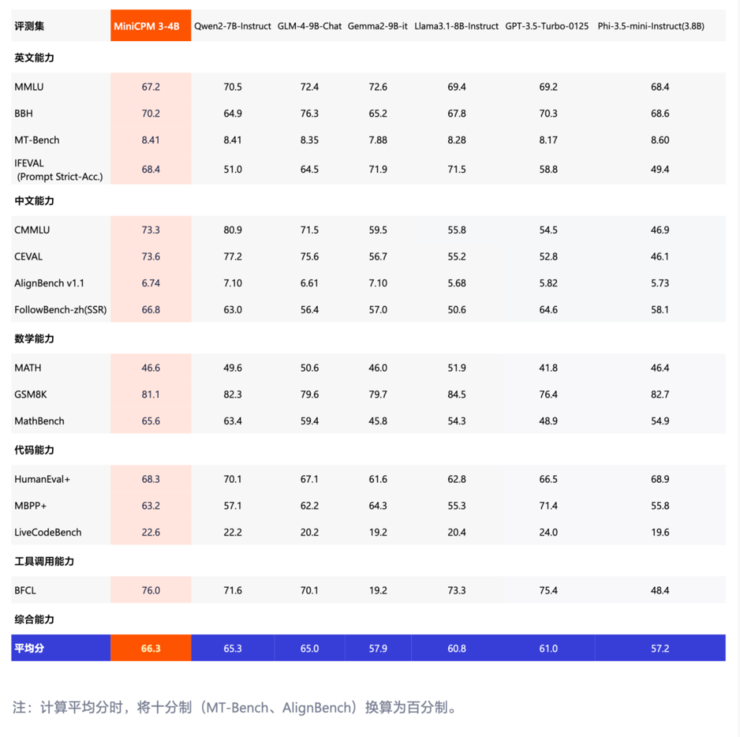 ① MiniCPM 3.0 表现超越 GPT-4、KimiChat、Qwen2-70B;