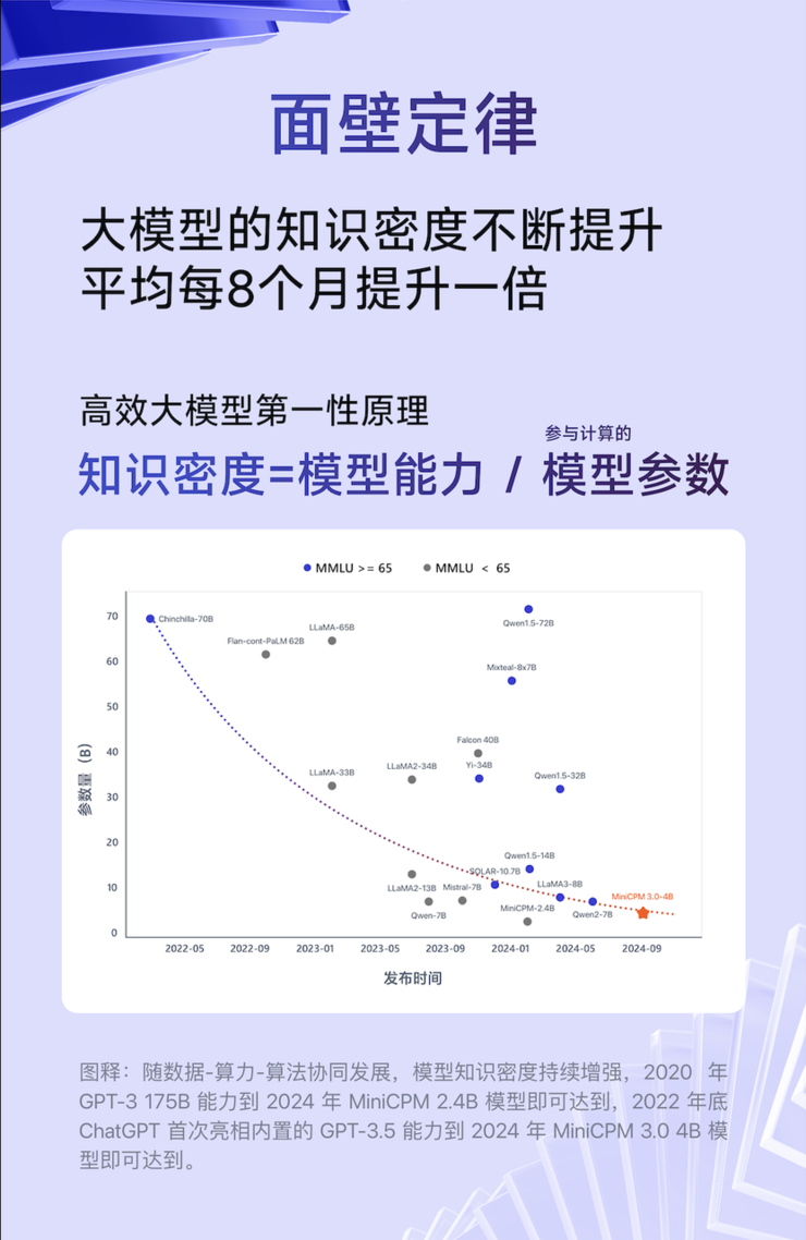 面壁紧紧围绕 Scaling Law 的核心,高效构建了大模型的科学化方法论,将提升知识密度视为高效大模型的第一性原理(知识密度 =模型能力/参与计算的模型参数),并且提出了大模型时代的「摩尔定律」:模型知识密度不断提升,平均每 8 个月提升一倍,称之为「面壁定律」。
