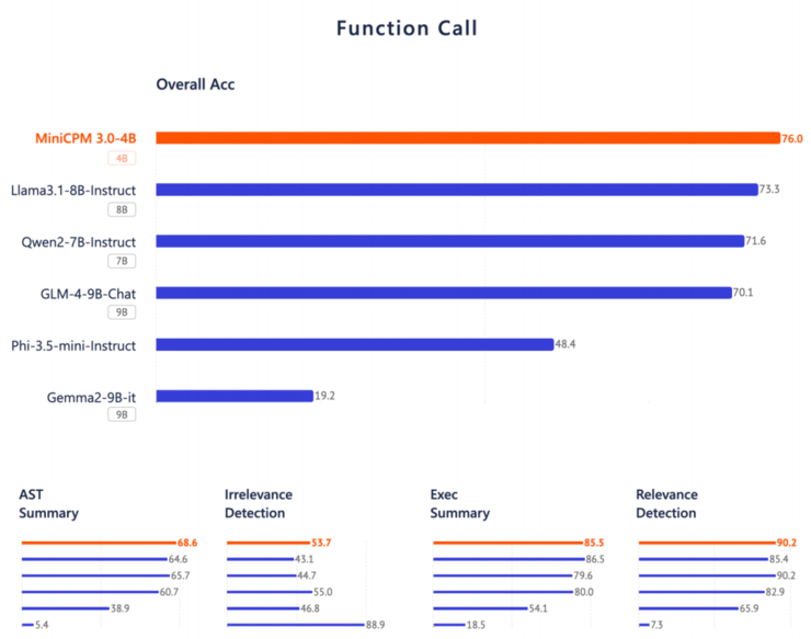 MiniCPM 3.0 拥有端侧最强 Function calling 性能 ,在权威评测榜单 Berkeley Function-Calling Leaderboard 上,其性能接近 GPT-4o,并超越 Llama 3.1-8B、Qwen-2-7B、GLM-4-9B 等众多模型。