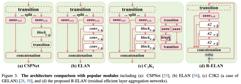与原始 ELAN 不同,R-ELAN 在整个 block 内引入从输入到输出的残差连接,并结合缩放因子(默认 0.01),以稳定训练并优化梯度流动。