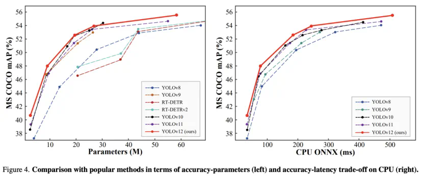 参数量 / CPU 速度 – 精度的 Trade-offs 比较:YOLOv12 在参数量和 CPU 推理速度方面上均实现了突破。如上图所示,实验结果显示,YOLOv12 在准确率 – 参数量平衡方面优于现有方法,甚至超越了参数量更少的 YOLOv10,证明了其高效性。此外,在 CPU(Intel Core i7-10700K @ 3.80GHz)上的推理速度测试中,YOLOv12 在不同 YOLO 版本中展现出最佳的计算效率。