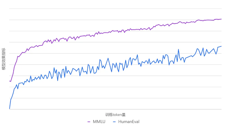 训练过程中MMLU、HumanEval的性能曲线持续拔高