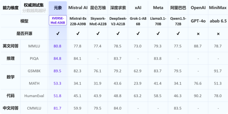 在多个权威评测中,元象MoE效果大幅超越多个同类模型,包括国内千亿MoE模型 Skywork-MoE、传统MoE霸主Mixtral-8x22B 以及3140亿参数的MoE开源模型Grok-1-A86B等。