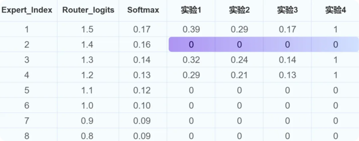 举例说明,假设N=8,K=4,M=3(2号专家上token被丢弃),不同专家权重的计算方式所得的权重如下图: