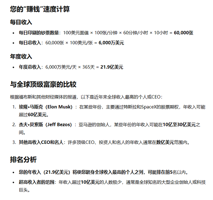 AI揭露了一个残酷的事实,就算你有一台24小时钞票打印机,一年赚的钱是2.4*21.9亿=52.56亿美元,面对1084亿美元还需要20台这种打印机才能跟马圣一较高下。单台印钞机甚至打不过排名前十的扎克伯格、贝索斯、谷歌的拉里·佩奇和谢尔盖·布林、微软的史蒂夫·鲍尔默、甲骨文的拉里·埃里森、英伟达的黄仁勋。