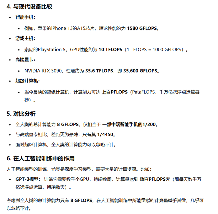 在咨询完爱搞机的小伙伴之后,80亿人类只是做心算/笔算的话那么产生8GFLOPS 的算力大概就是略高于苹果发布于 2010 年搭载 A4 芯片算力 6.8 GFLOPS 的 iphone4。